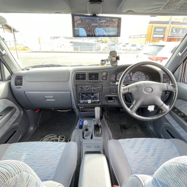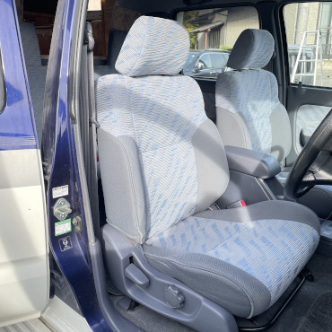 後席は前向きシートが3列と横乗り2名で乗車定員10名の珍しい車両でした。外装のボディにトイレのタンクを出し入れする扉が付いているので、トイレルームを撤去し前向きシートに変更したようですね。オーナーさんも譲って頂いた車両のようで、詳細までは分かりませんでしたが。