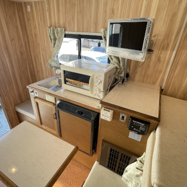 FFヒーター、1500Wインバーター、ツインサブバッテリー、16インチTV、冷蔵庫、外部電源、外部充電器、集中パネルスイッチ、小型ベンチレーター、リヤスピーカー、ナビ、バックカメラ付きです。