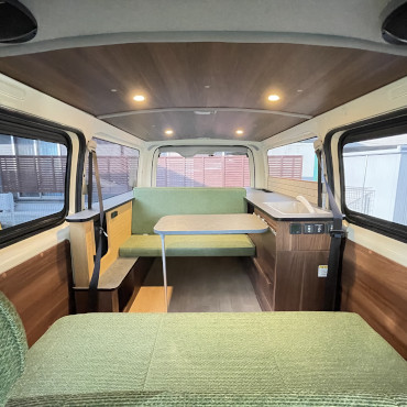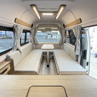 こちらの車両は軽自動車登録ベースで、駐車スペースに困らない、維持費も安い、ポップアップルーフが付いている事で就寝人数も確保でき、夫婦二人旅やプラス小さいお子さん連れにピッタリな車両ですね。