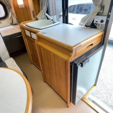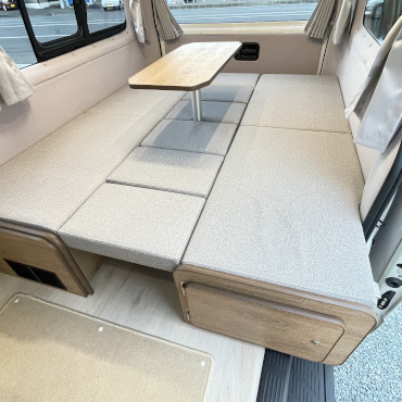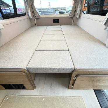 乗車定員7名、就寝定員6名、二段ベット下の収納スペースなど家族が多い方にはピッタリです。使用人数が少ない場合でも、二段ベット又はバンクベットを収納スペースとして活用する事も出来ちゃう、使い勝手の良いキャンピングカーになります。