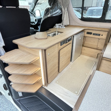 8ナンバー、シンク、冷蔵庫、ツインサブバッテリー、外部電源、外部充電器、トヨタセーフティセンス、LED照明、ファスプシート(前向き後向きシート)が付いており、日常でも使いやすいボディサイズのキャンピングカーです。