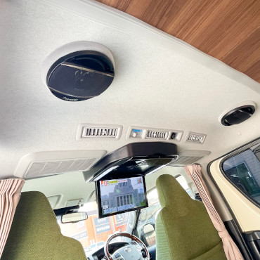 レザーシート、サブバッテリー2個、冷蔵庫、シンク、400Wインバーター、コンバーター、電圧計、リアクーラー、リアヒーター、デジタルインナーミラー、パノラミックビューモニター、LEDヘッドライト
