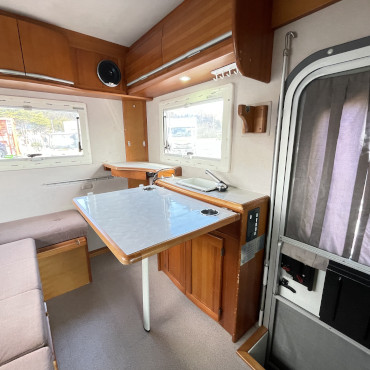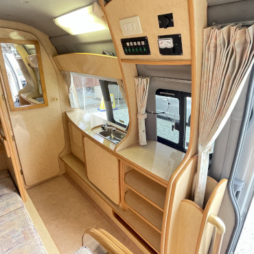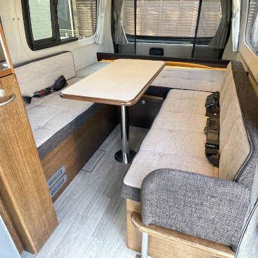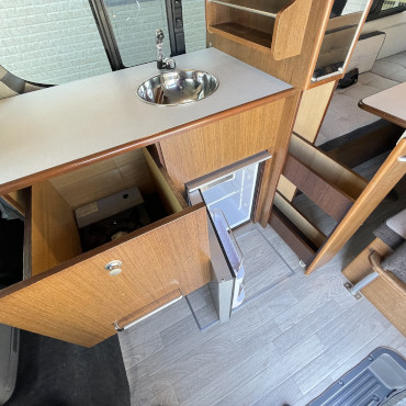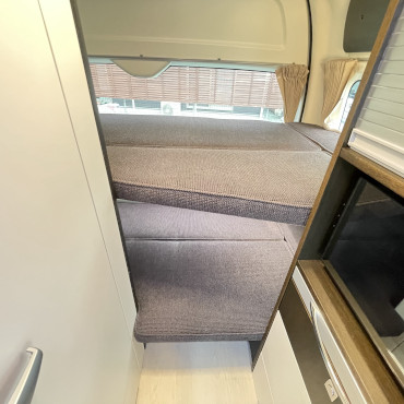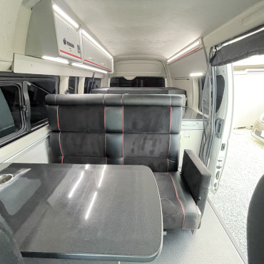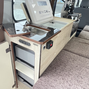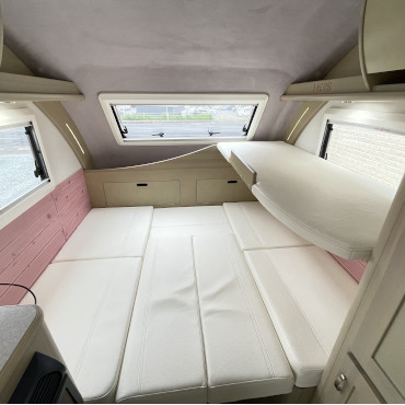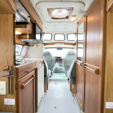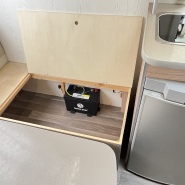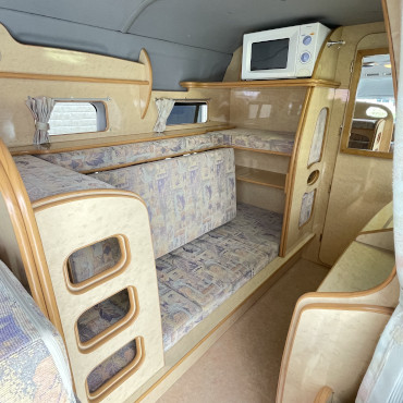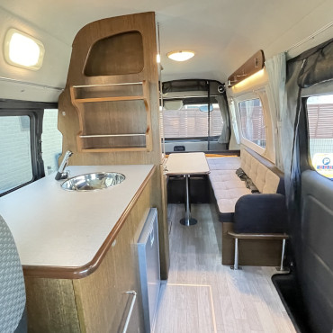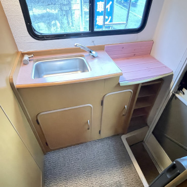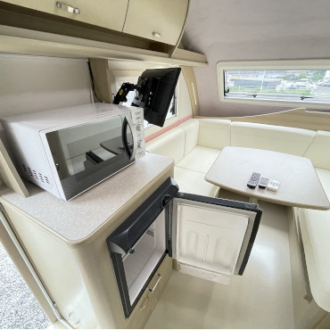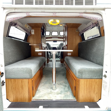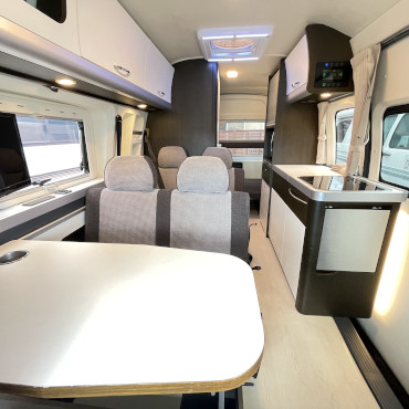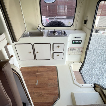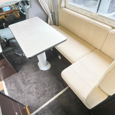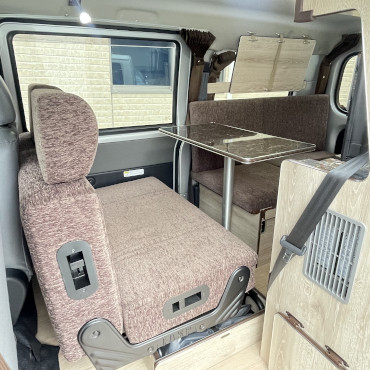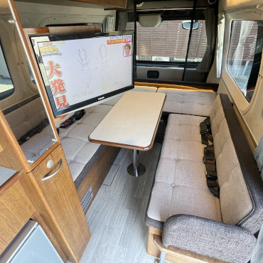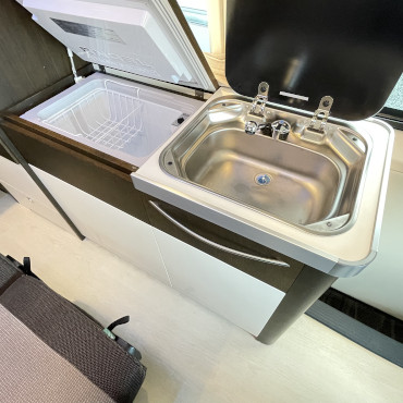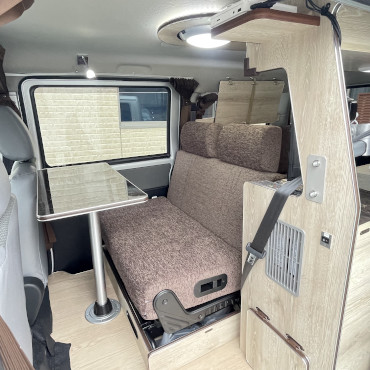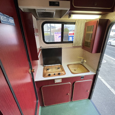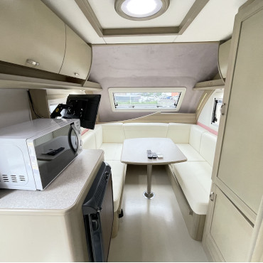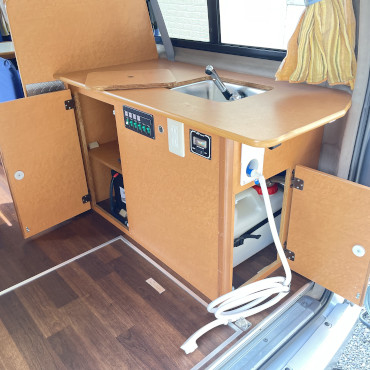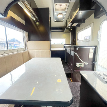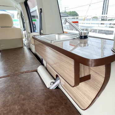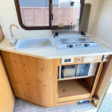 こちらのモデルはスライドドアを開けると正面にキッチンスペースがあり、キッチン前のスペースは広々していて、後方にコの字タイプのシートで2人旅にはピッタリな使いやすいレイアウトになります。