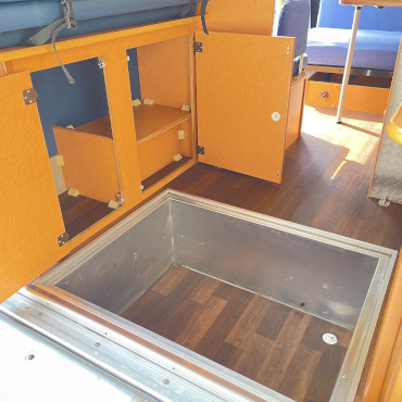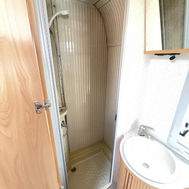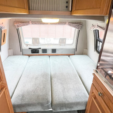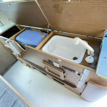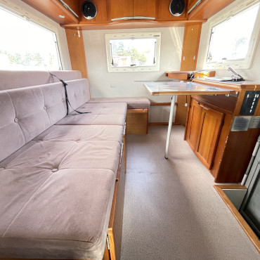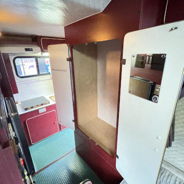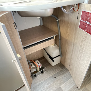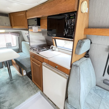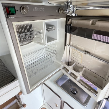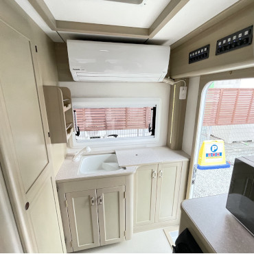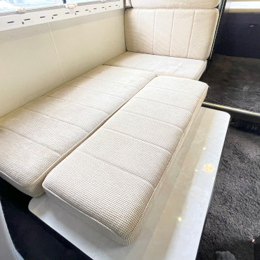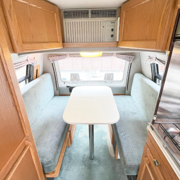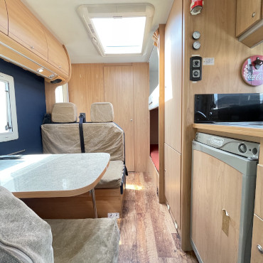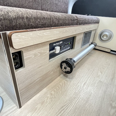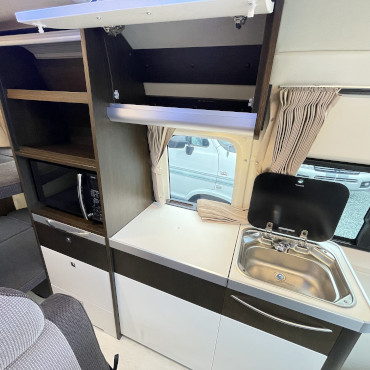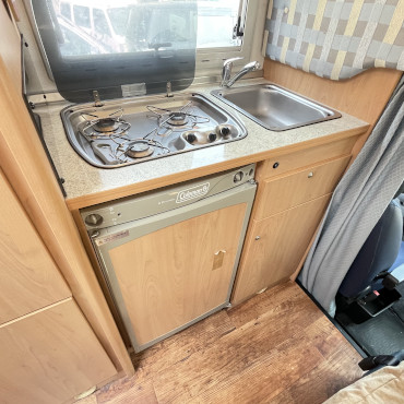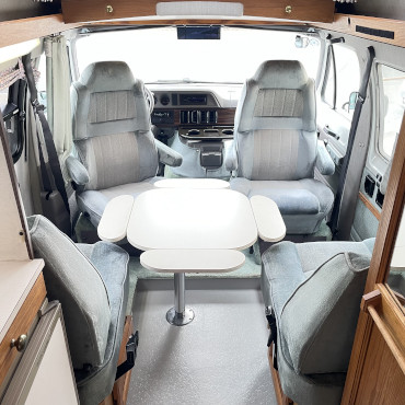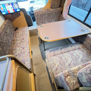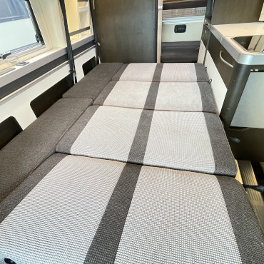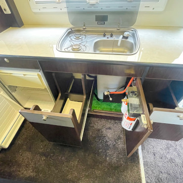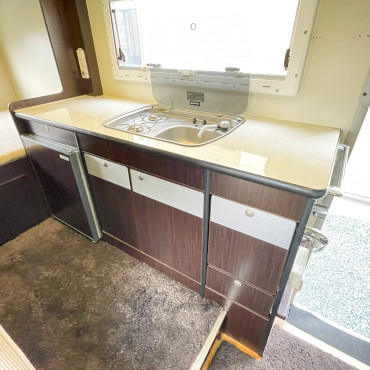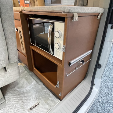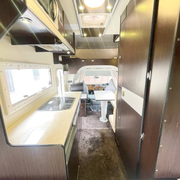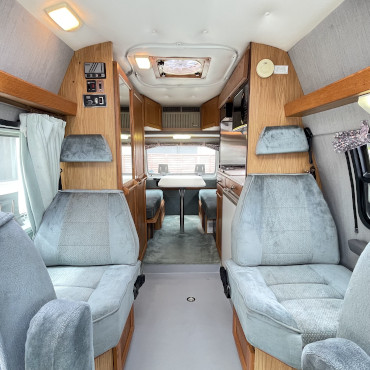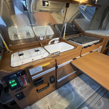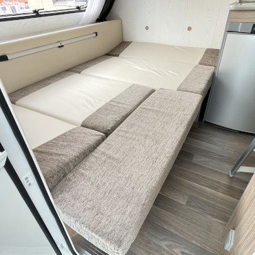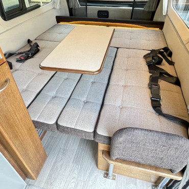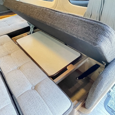 こちらのモデルはスライドドアを開けると正面にキッチンスペースがあり、キッチン前のスペースは広々していて、後方にコの字タイプのシートで2人旅にはピッタリな使いやすいレイアウトになります。