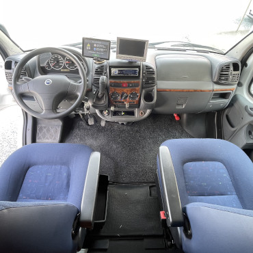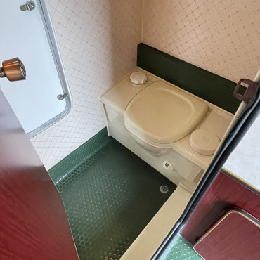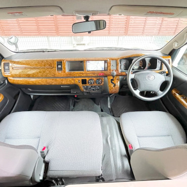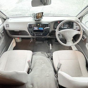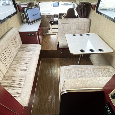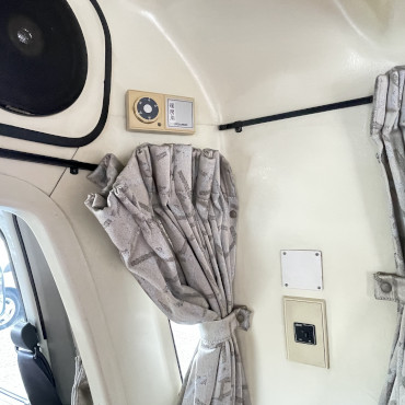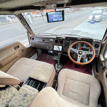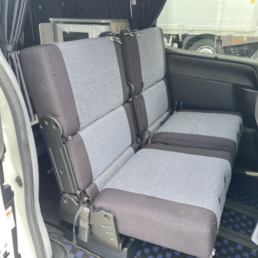 後席は前向きシートが3列と横乗り2名で乗車定員10名の珍しい車両でした。外装のボディにトイレのタンクを出し入れする扉が付いているので、トイレルームを撤去し前向きシートに変更したようですね。オーナーさんも譲って頂いた車両のようで、詳細までは分かりませんでしたが。