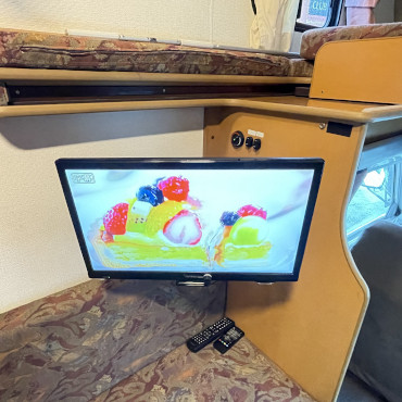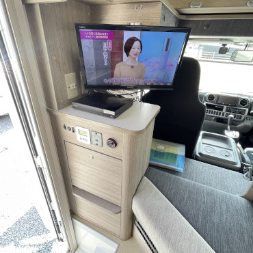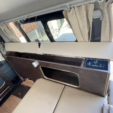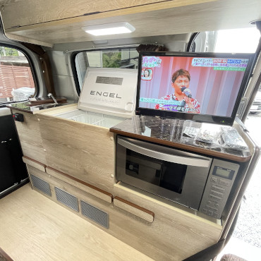 FFヒーター、1500Wインバーター、ツインサブバッテリー、16インチTV、冷蔵庫、外部電源、外部充電器、集中パネルスイッチ、小型ベンチレーター、リヤスピーカー、ナビ、バックカメラ付きです。