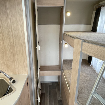 上段ベッドがスライド式で展開でき、ベッド下には広々とした荷物スペースもある、ファミリーでも使用可能な使い勝手の良いモデルになります。