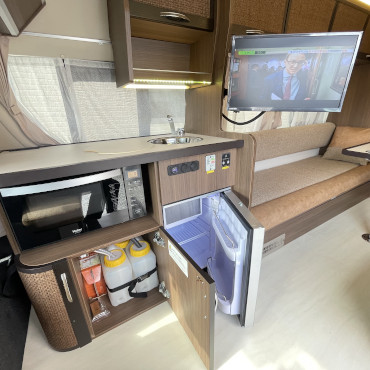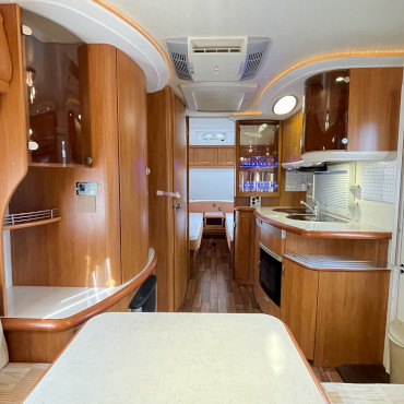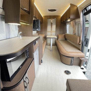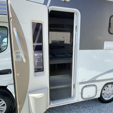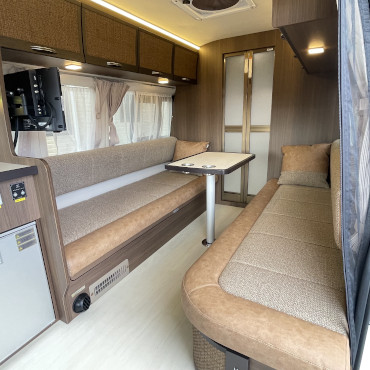 ルーフエアコン、ソーラーパネル、サイドオーニング、ムーバー、温水ボイラー、トイレ、テレビと装備も全て揃っており、室内の広さも含め文句なしの一台です。