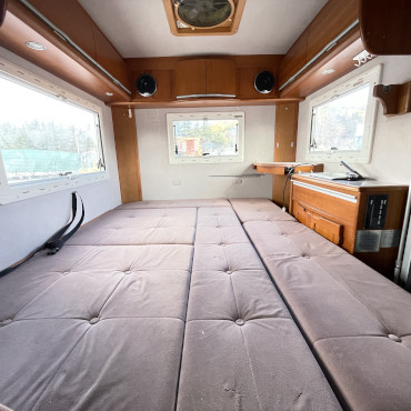 ソーラーパネル、FFヒーター、トリプルサブ、1500Wインバーター、カセットトイレ、冷蔵庫、オプション追加ベッドマット、サイクルキャリア、リアラダー、アウトリガー、ビルシュタインショック、pivotクルーズコントロールなど充実した装備の一台です。