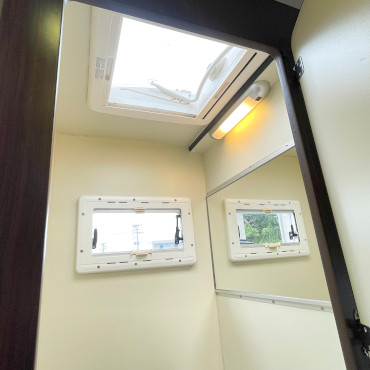 8ナンバー、シンク、冷蔵庫、ツインサブバッテリー、外部電源、外部充電器、トヨタセーフティセンス、LED照明、ファスプシート(前向き後向きシート)が付いており、日常でも使いやすいボディサイズのキャンピングカーです。